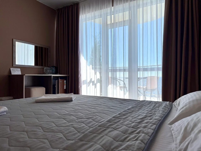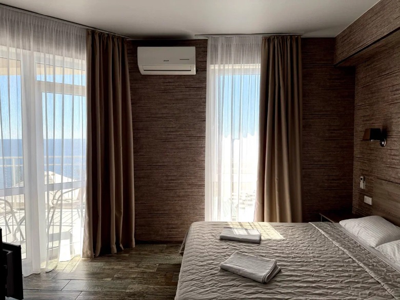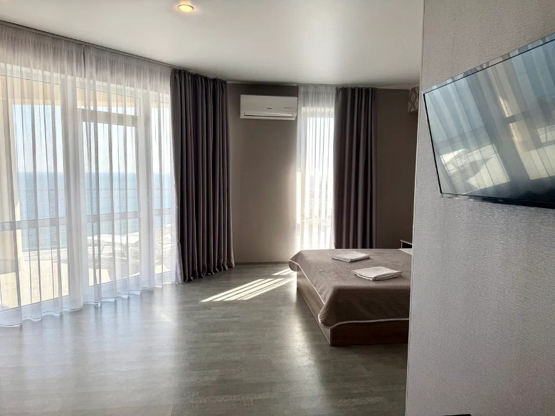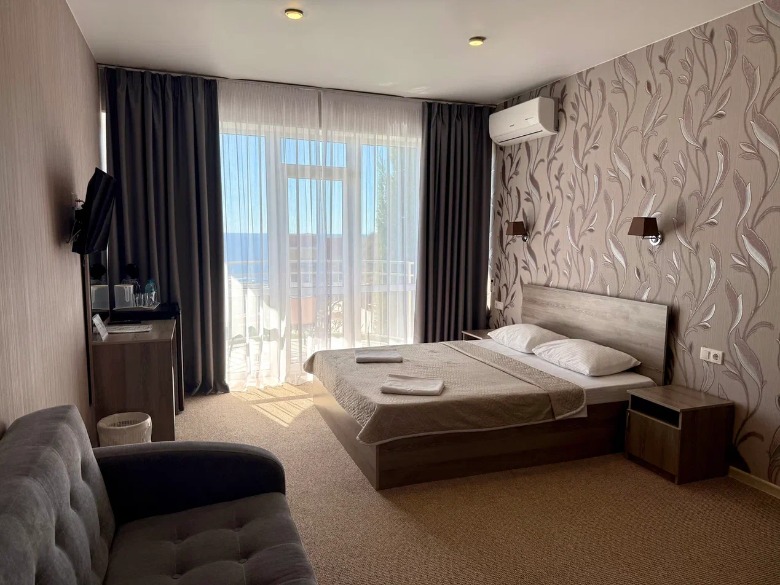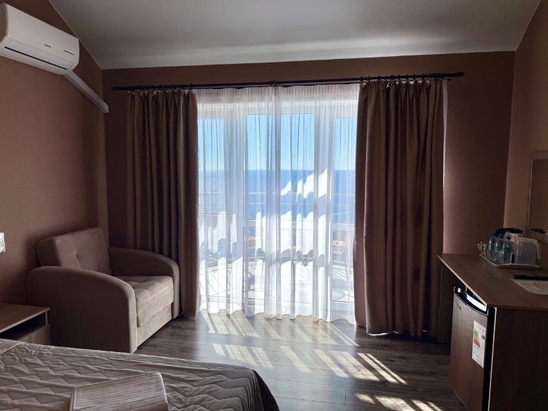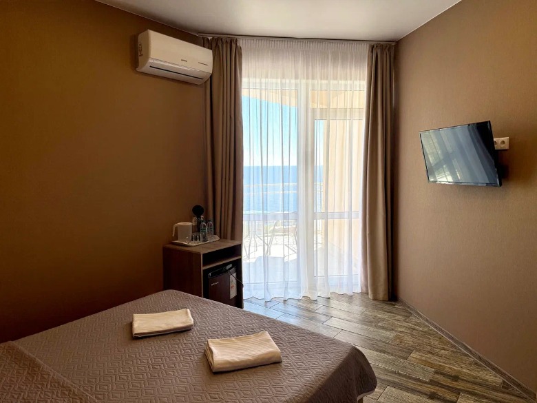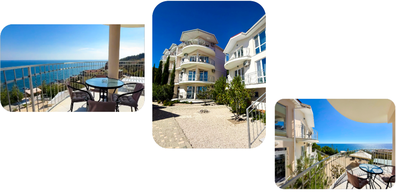 Здание гостевого дома построено таким образом, что из каждого номера, кроме первого этажа, видно морские просторы. Одной из особенностей является наличие широких и просторных террас, где можно загорать на шезлонге, не выходя из номеров и смотреть на море.