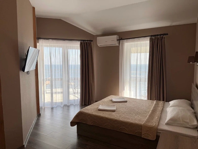 Здание гостевого дома построено таким образом, что из каждого номера, кроме первого этажа, видно морские просторы. Одной из особенностей является наличие широких и просторных террас, где можно загорать на шезлонге, не выходя из номеров и смотреть на море.